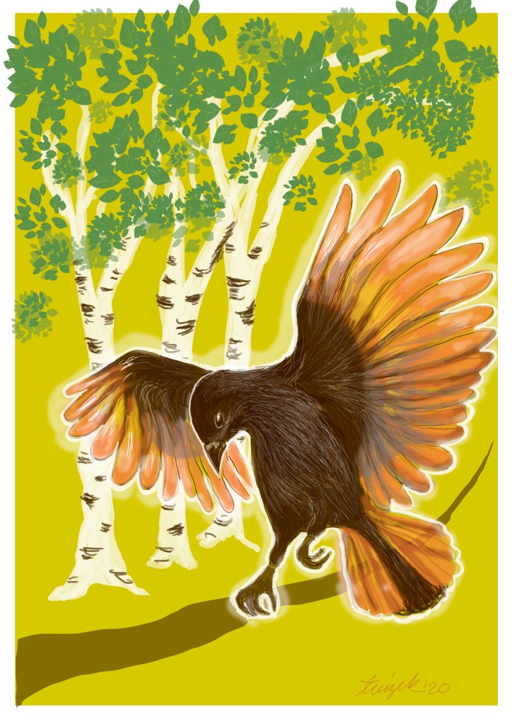 Sain kaverilta Facebookhaasteessani seuraavat speksit: kuukkeli, kolme koivua ja polku. Väritoiveina oli Polttava oranssi, lämmin keltainen, vihreä, ruskea ja valkoinen. Lisäsin kuvaan hieman harmaata, koska kuukkeli selvästi kaipasi sitä.