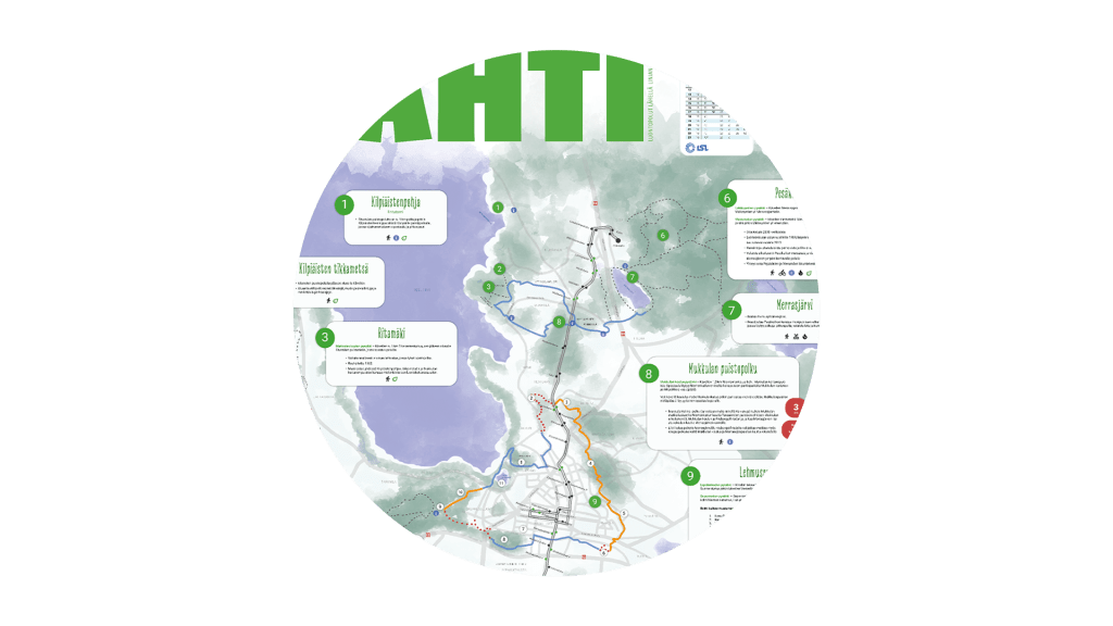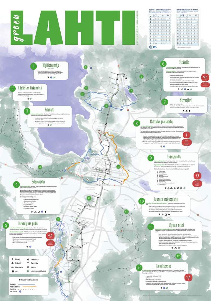 Informaatiokartta Lahden bussireitistä numero 31. Tavoitteenani oli visualisoida, kuinka paljon ja lähellä Lahden keskustaa löytyy urbaaneja luontopolkuja. Polut ovat saavutettavissa bussipysäkeiltä lyhyen kävelymatkan päästä.