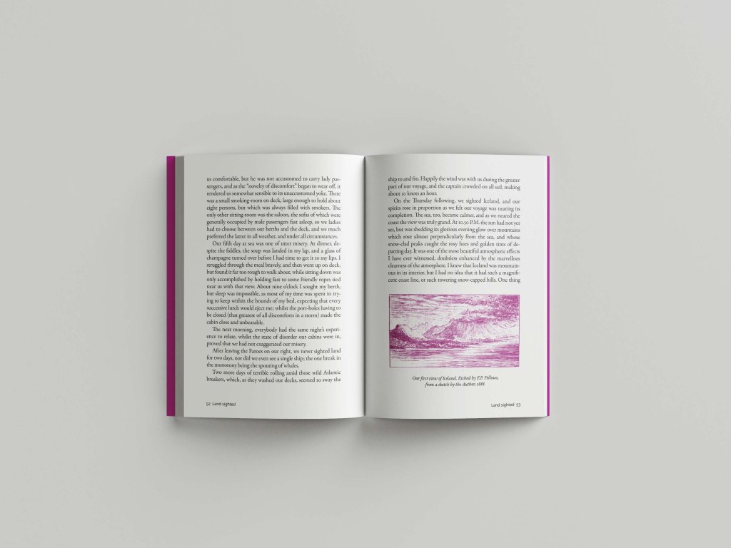 Koulutehtävänä oli modernisoida Ethel Brillianna Tweedyn A girls ride in Iceland -kirjan taitto ja visuaalinen ilme.